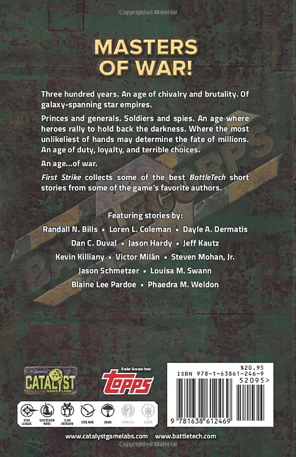 First Strike collects some of the best BattleTech short stories from some of the game's favorite authors, including Randall N. Bills, Blaine Lee Pardoe, Jason Schmetzer, Jason Hardy, Jeff Kautz, Dan C. Duval, Loren L. Coleman, Kevin Killiany, Victor Milán, Phaedra Weldon, Steven Mohan, Jr., Dayle A. Dermatis and Louisa Swann.