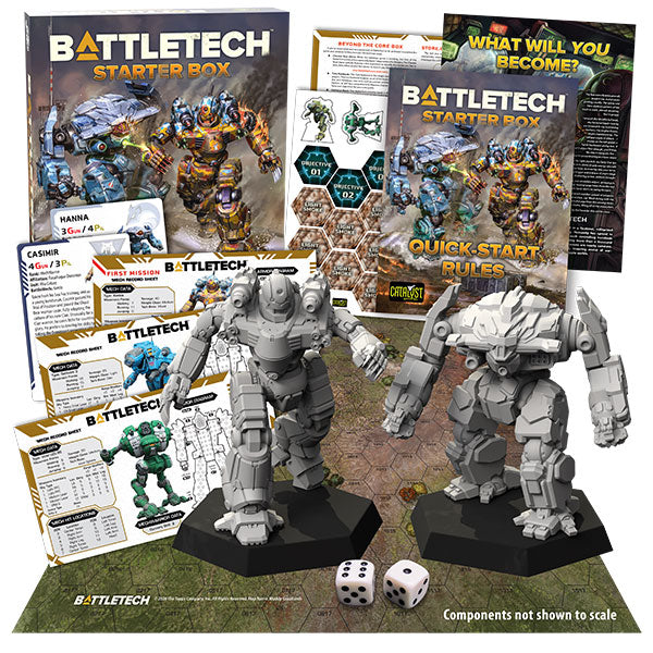 The BattleTech Starter Box is the first step on that fantastic journey and includes everything you need to get started: two high-quality miniatures, quick-start rules, a mapsheet, cards to represent your MechWarrior’s unique skills, dice, and more.