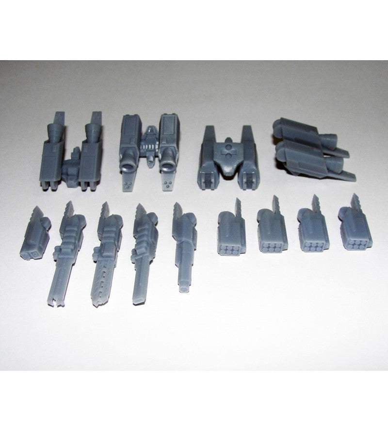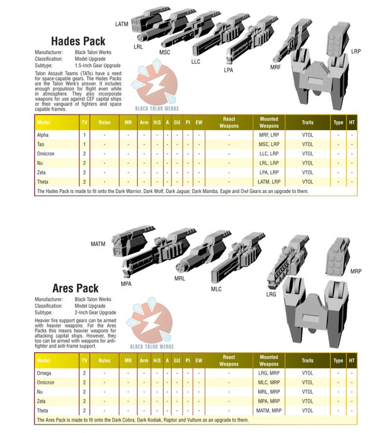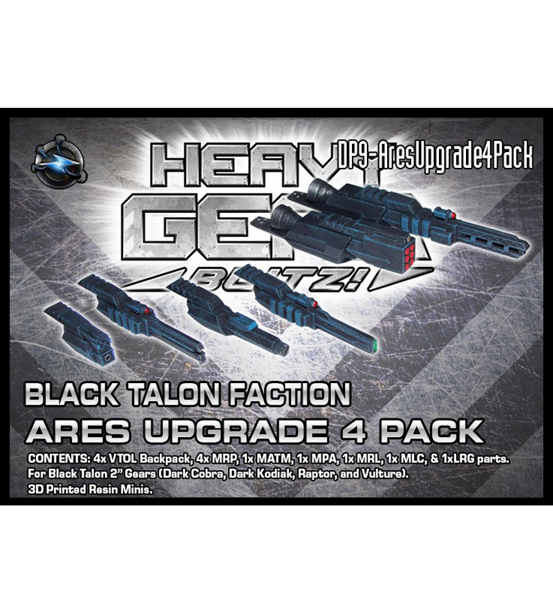 The Ares Upgrade 4 Pack for Black Talon's 2" Gears (Dark Cobra, Dark Kodiak, Raptor and Vulture) giving VTOL plus 1x MRP and a second weapon choice of either 1x MATM, 1x MPA, 1x MRL, 1x MLC, or 1x LRG. Using the Ares packs requires removing the old V-Engines and any back mounted or shoulder mounted weapons for the packs to fit. We have included images below of the Hades and Ares HGB Stats Sheet, the resin parts, and photos of the available Ares Pack weapon options mounted on a Dark Kodiak miniature (sold separately) .