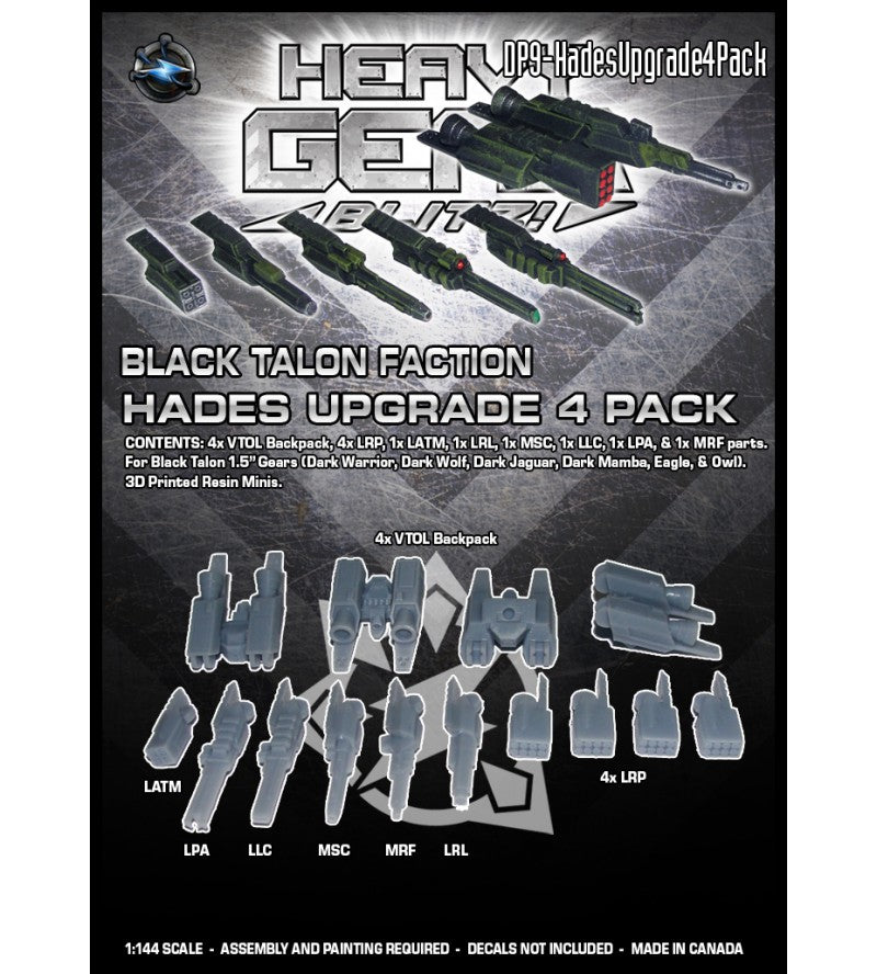 The Hades Upgrade 4 Pack for Black Talon's 1.5" Gears (Dark Warrior, Dark Wolf, Dark Jaguar, Dark Mamba, Eagle, and Owl) giving them VTOL plus the following weapons 1x LRP and a second weapon choice of either 1x LATM, 1x LRL, 1x MSC, 1x LLC, 1x LPA, or 1x MRF. Using the Hades packs requires removing the old V-Engines and any back mounted or shoulder mounted weapons for the packs to fit. We have included images below of the Hades and Ares HGB Stats Sheet, the resin parts, and photos of the available Hades Pack weapon options mounted on a Dark Mamba miniature (sold separately) .