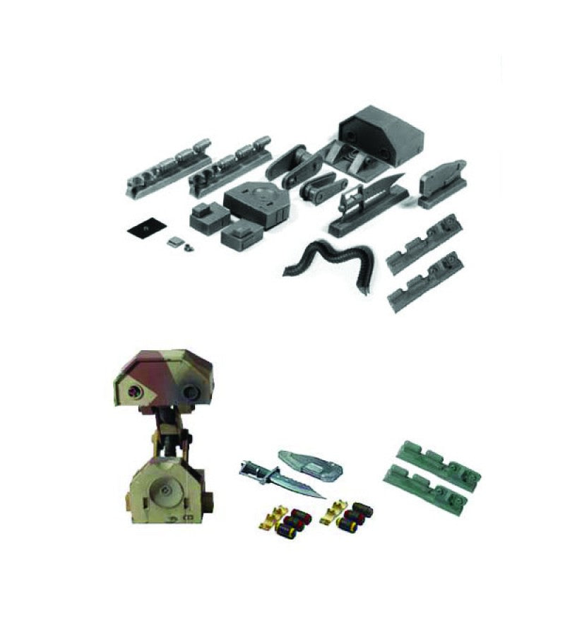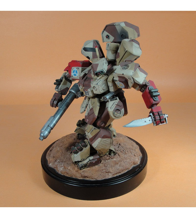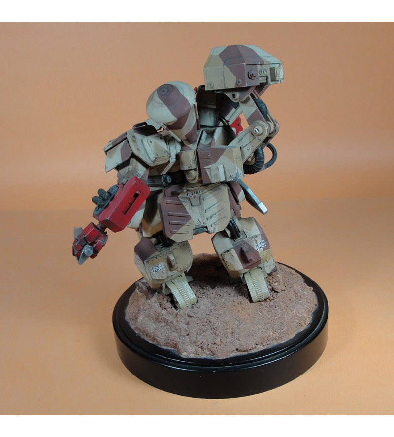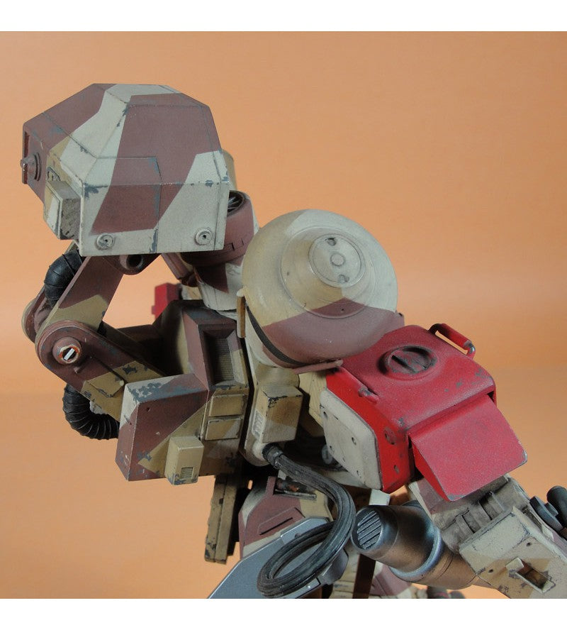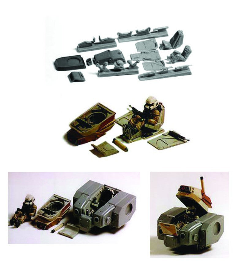 Because of these features, the Kodiak was a natural choice to be the first Gear to be translated into model kit format. The standard military model 1/35 scale was chosen both to provide an impressively large piece and to allow modelers to use parts from the large plastic armor kit collection that already exists at this scale. The model is cast in a plastic-like, high quality resin to hold a maximum of details while still remaining easy to work with. Great pains were taken to ensure that the casting of each part is done as cleanly as possible, reducing the modeler's work load and preserving the intricate surface detail. The Kodiak model is composed of over 70 individual parts, allowing the modeler to choose from a wide range of postures for the finished product. Assembly is extremely simple: many parts are joined by coded pins and plugs, ensuring each part fits perfectly in its intended position and nowhere else.