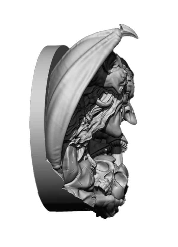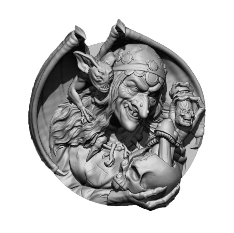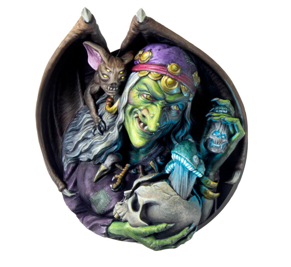 The Crone is approximately 59mm wide, 68mm tall, and 38mm deep. Includes Texture Trainer Stand for displaying.
