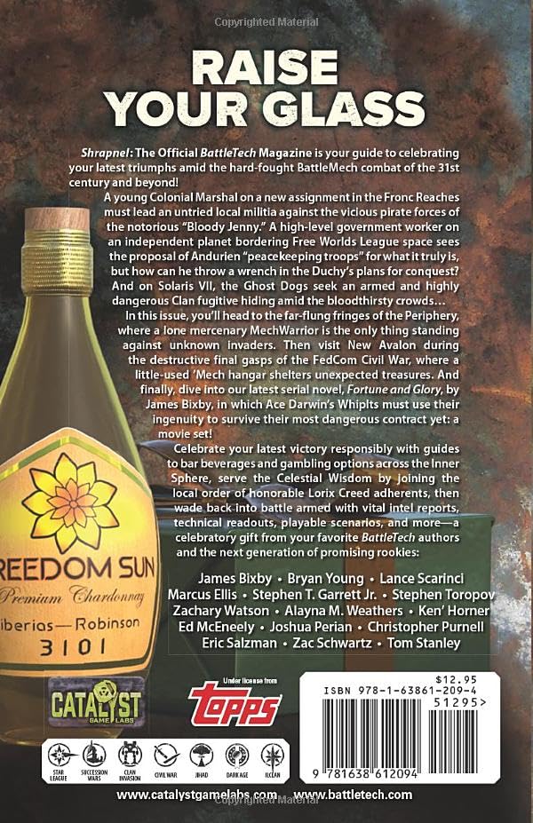 Celebrate your latest victory responsibly with guides to bar beverages and gambling options across the Inner Sphere, serve the Celestial Wisdom by joining the local order of honorable Lorix Creed adherents, then wade back into battle armed with vital intel reports, technical readouts, playable scenarios, and more—a celebratory gift from your favorite BattleTech authors and the next generation of promising rookies: