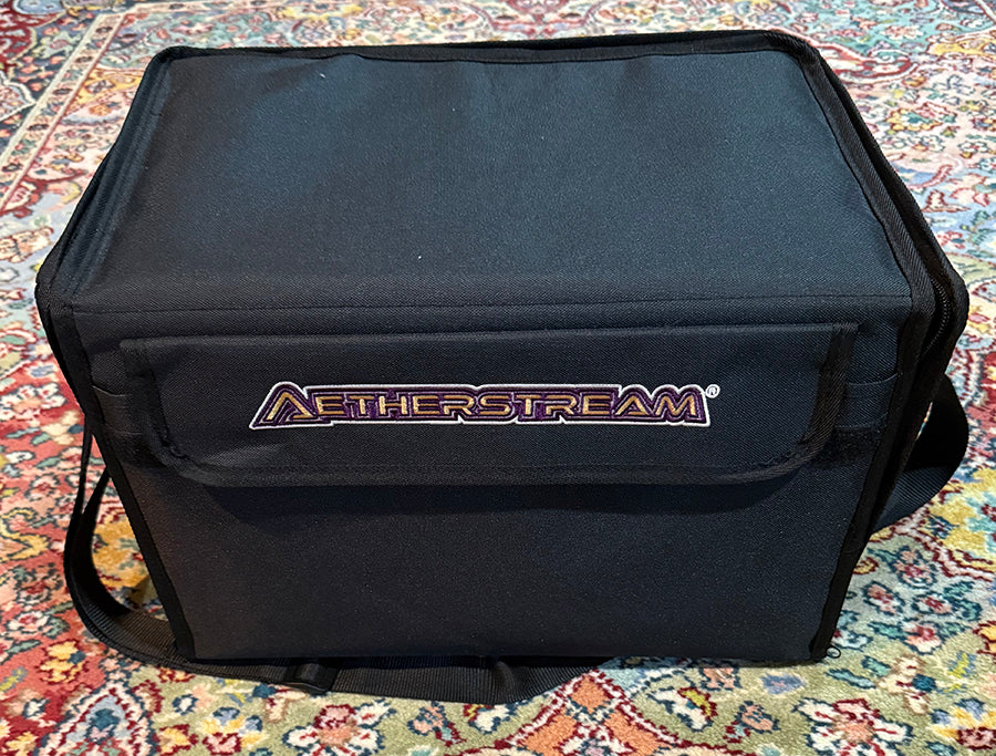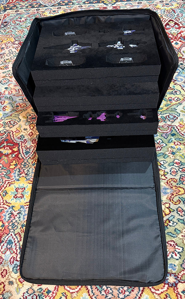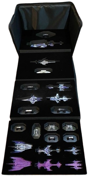 This sturdy carry case come with foam trays with custom cutouts for your Leviathan fleets. This case is configured for the Callistonian Empire fleet. There is room for a fleet made up of one each of the individual ship boxes, models and stands. The case itself has front and side pockets with Velcro flaps and Aetherstream embroidery on the front and back. An adjustable shoulder strap completes the set.