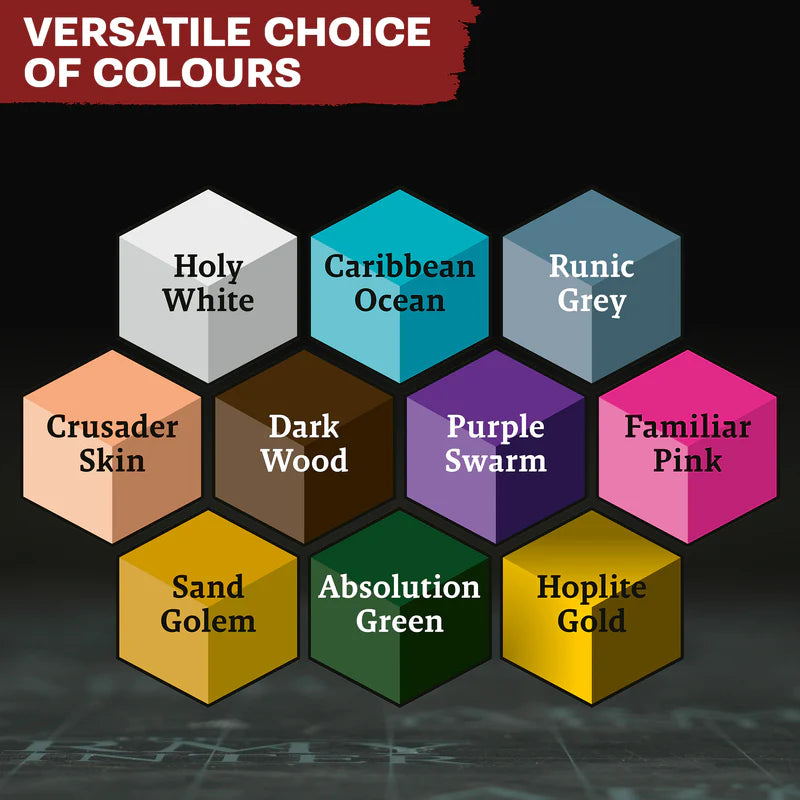 Inside are the 10 newest Speedpaint Markers featuring Speedpaint 2.0 colours chosen to expand your storytelling range without duplicates or guesswork. This easy add-on brings new hues that make painting even more flexible, whether you’re touching up characters, tackling new armies at lightning speed, or adding metallic highlights.