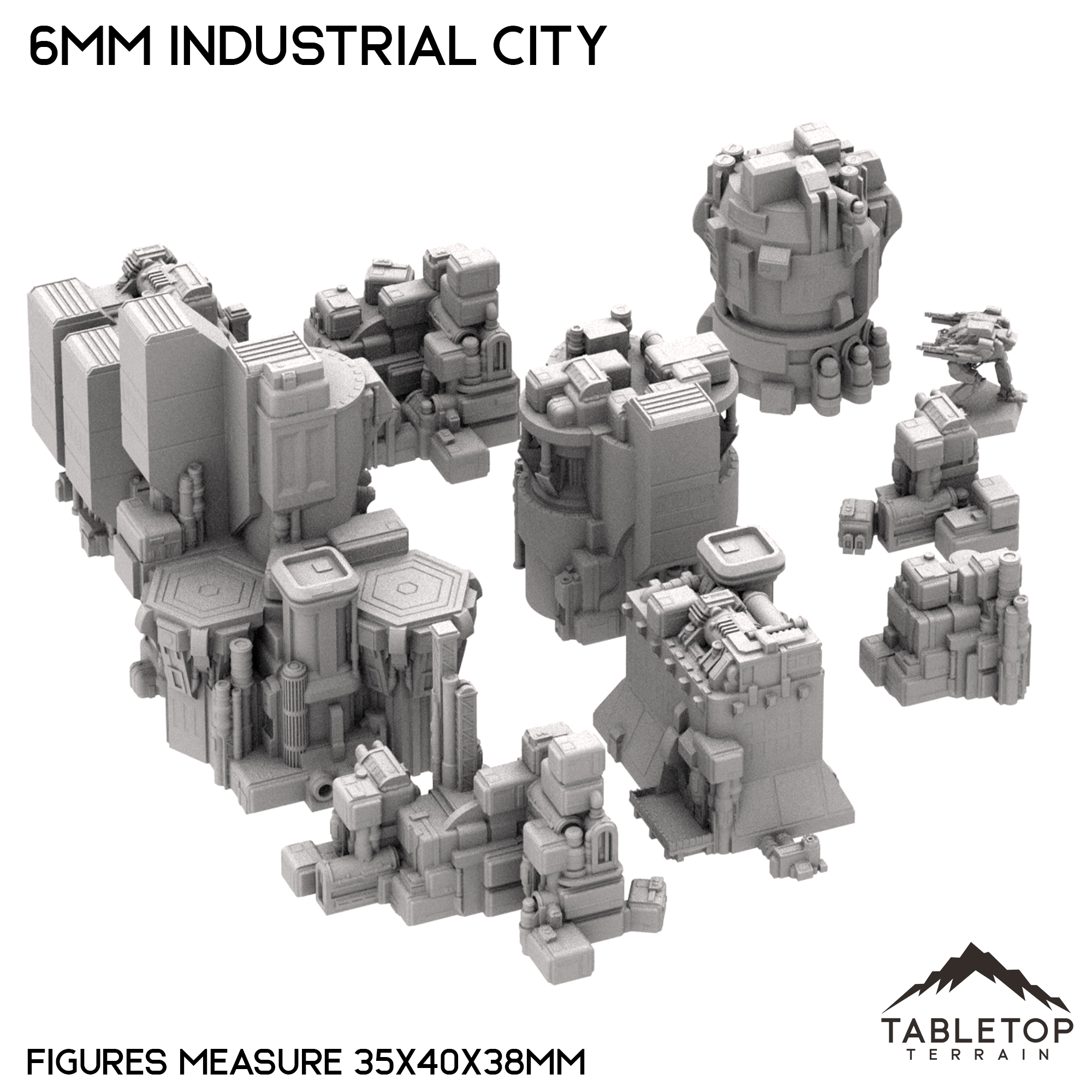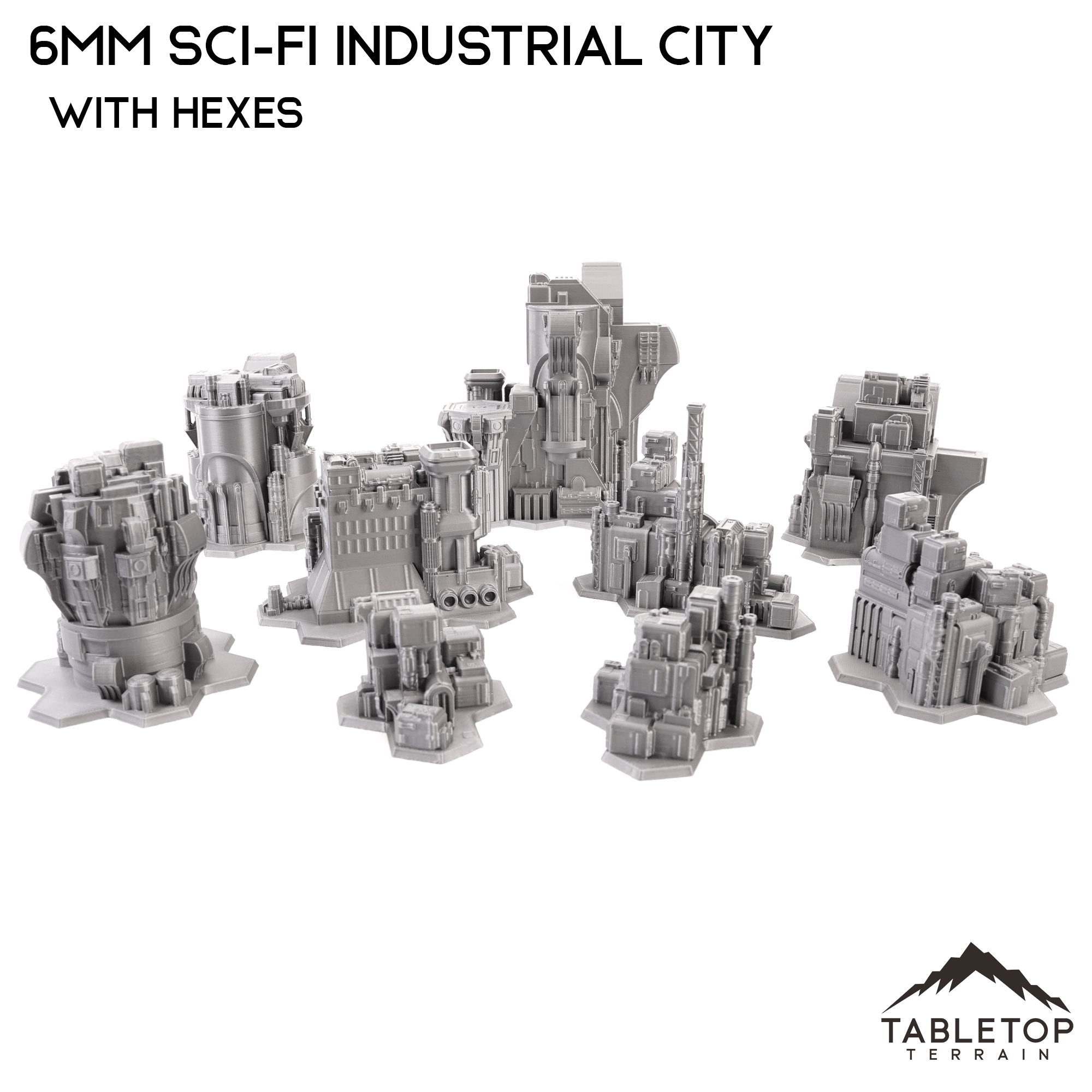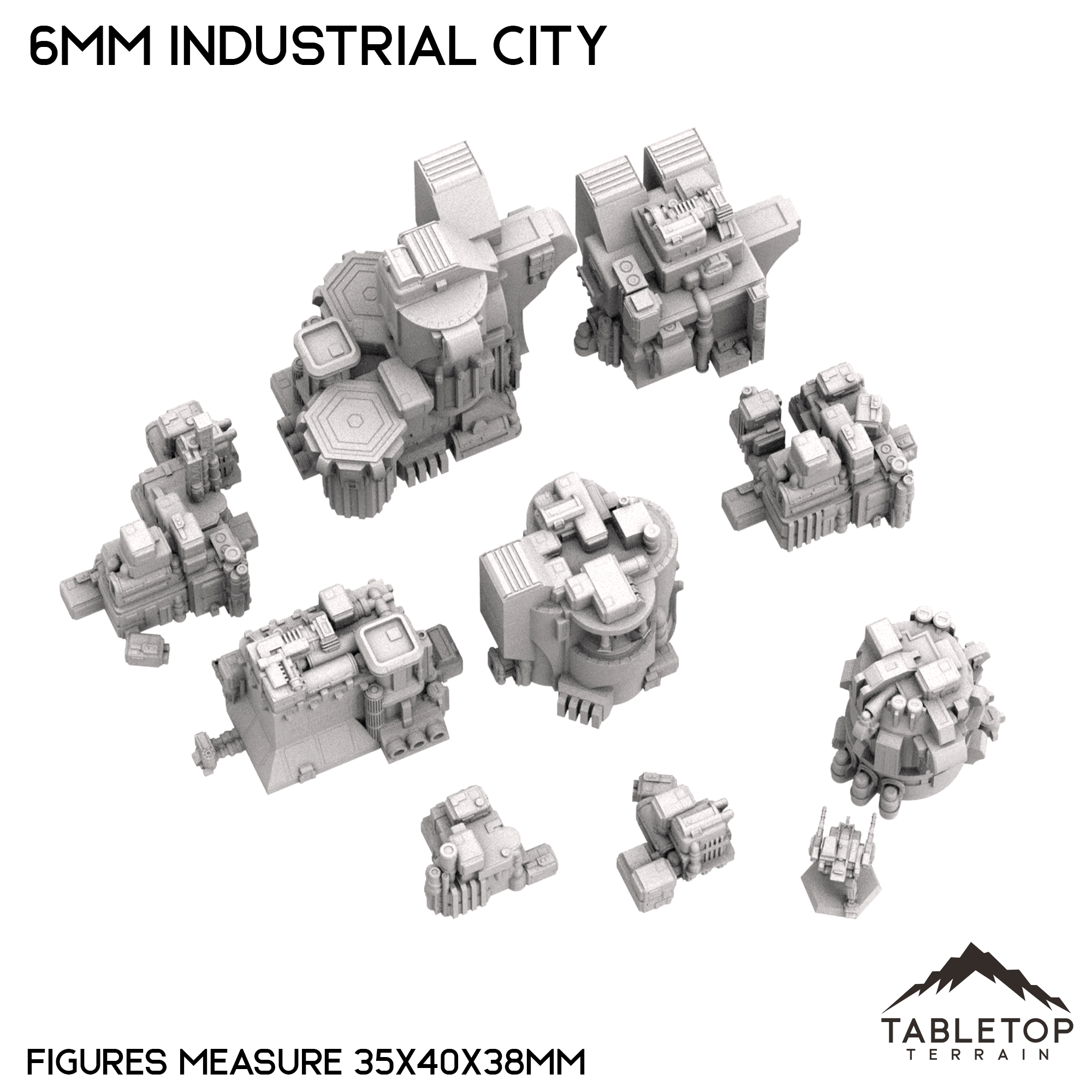 A set of 9 6mm Sci-Fi Industrial City buildings. You can choose to have them come with or without hexes. It would work great in any 6mm mech scale tabletop wargame.